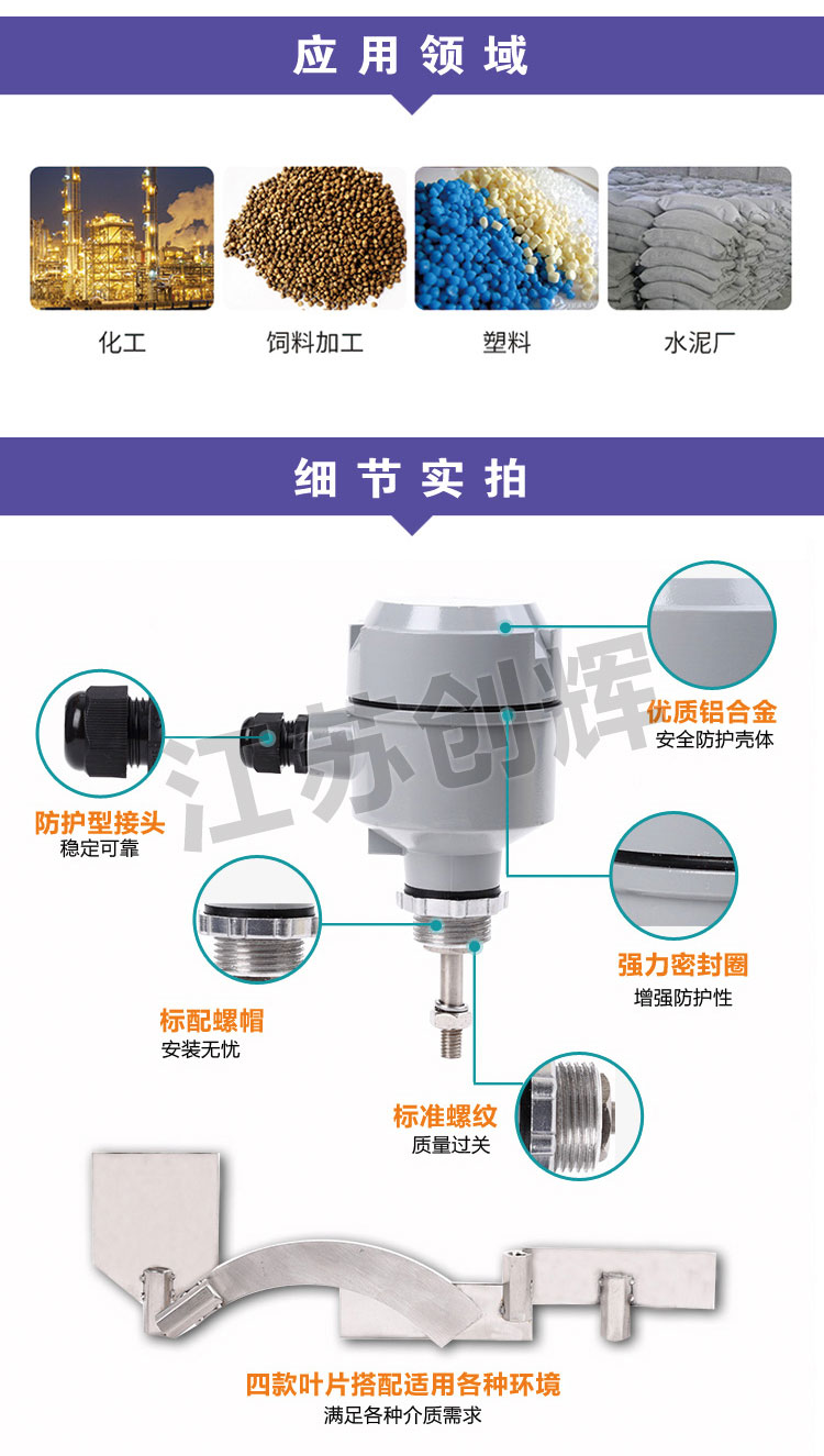 CH-ZX系列阻旋料位開(kāi)關(guān)是一種用于固態(tài)物料(包括粉狀、粒狀、塊狀、膠狀等)的物位控制器。阻旋料位開(kāi)關(guān)具有密封性好、過(guò)載能力強(qiáng)(具有過(guò)載保護(hù))、輕便易裝、輸出觸點(diǎn)容量大等特點(diǎn)。針對(duì)不同比重的物料可通過(guò)調(diào)整彈簧的拉力來(lái)實(shí)現(xiàn),其接觸物料部分全為不銹鋼材料。阻旋式料位開(kāi)關(guān)在化工、塑料、水泥、制藥、飼料、食品等行業(yè)得到了**的應(yīng)用。江蘇創(chuàng)輝儀表是**的阻旋料位開(kāi)關(guān)廠家,價(jià)格咨詢(xún)電話(huà)15358667860。