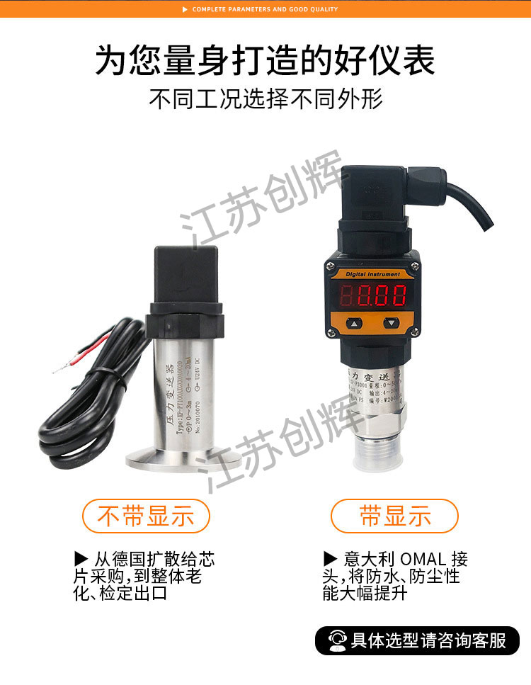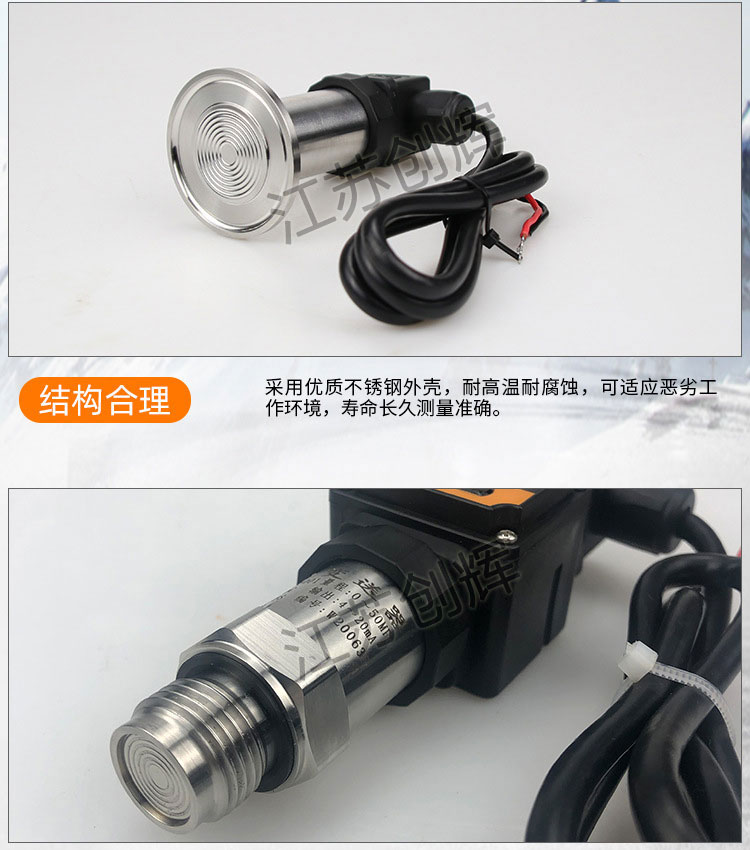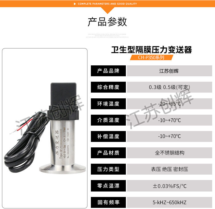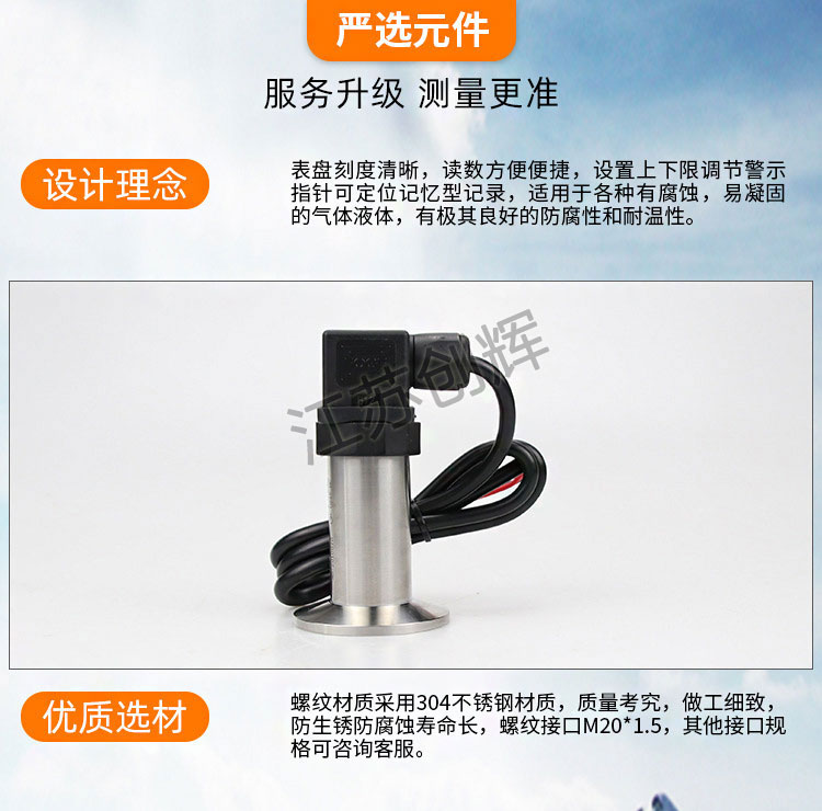 CH-2088W衛(wèi)生隔膜壓力變送器是專門為醫(yī)藥、啤酒、奶倉等醫(yī)藥食品領域設計的專用型產(chǎn)品,該系列采用E+H**技術,其設計完全遵照醫(yī)藥食品行業(yè)的衛(wèi)生級標準。利用齊平大波紋片使測量介質與壓力傳感器相隔離,其間灌充衛(wèi)生及專用油,可保證在介質溫度150℃的高溫下無溫漂的穩(wěn)定工作??头四壳肮I(yè)現(xiàn)場上常用齊平式擴散硅或陶瓷電容變送器因傳感器直接接觸介質,從而在高溫情況下溫漂大,導致超差,尤尤其是滅菌環(huán)境節(jié)時變送器極容易損壞的弊病。